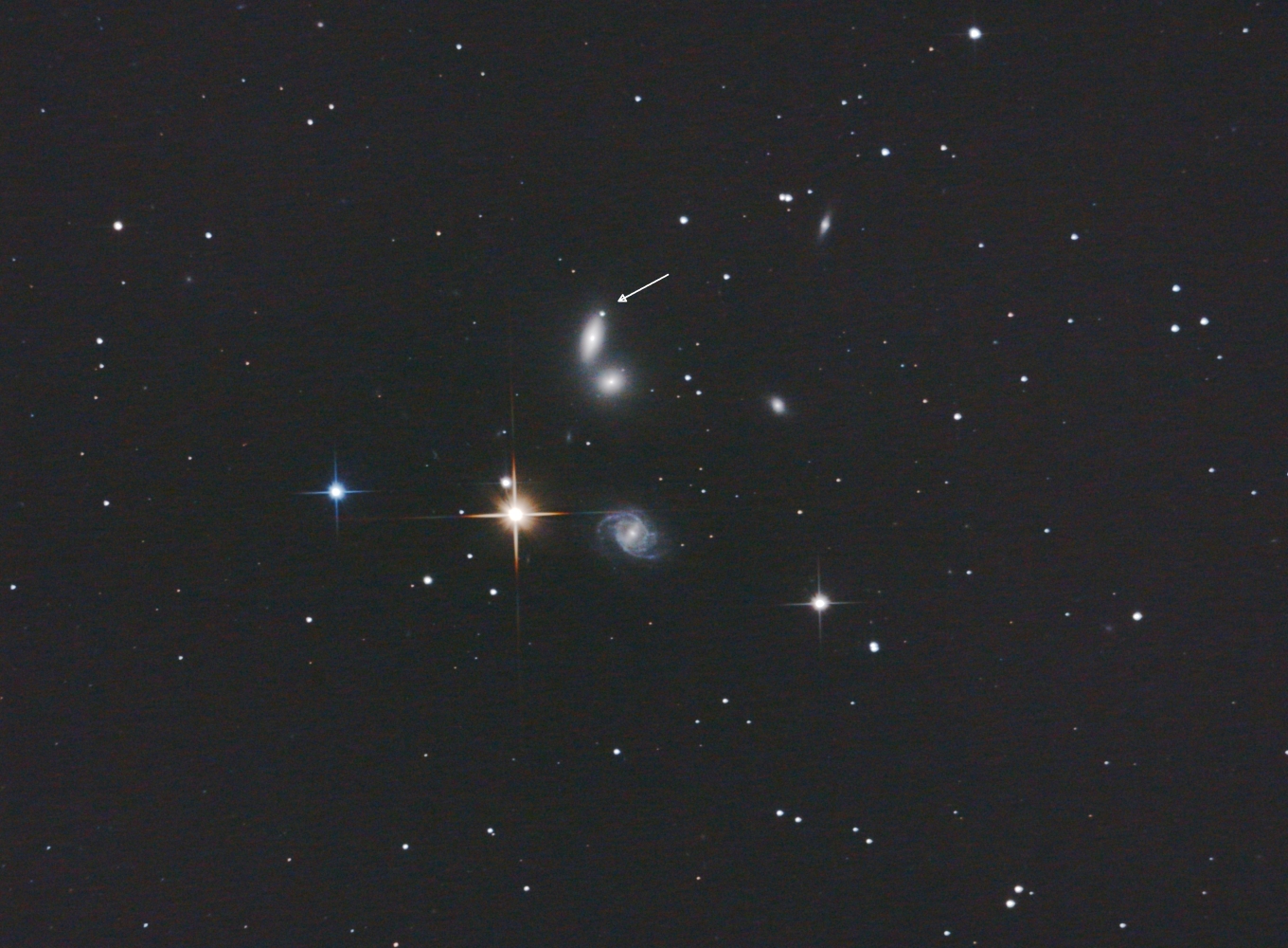 La flêche indique la supernova SN2019ein apparue le 1er mai 2019 dans la galaxie NGC 5353.