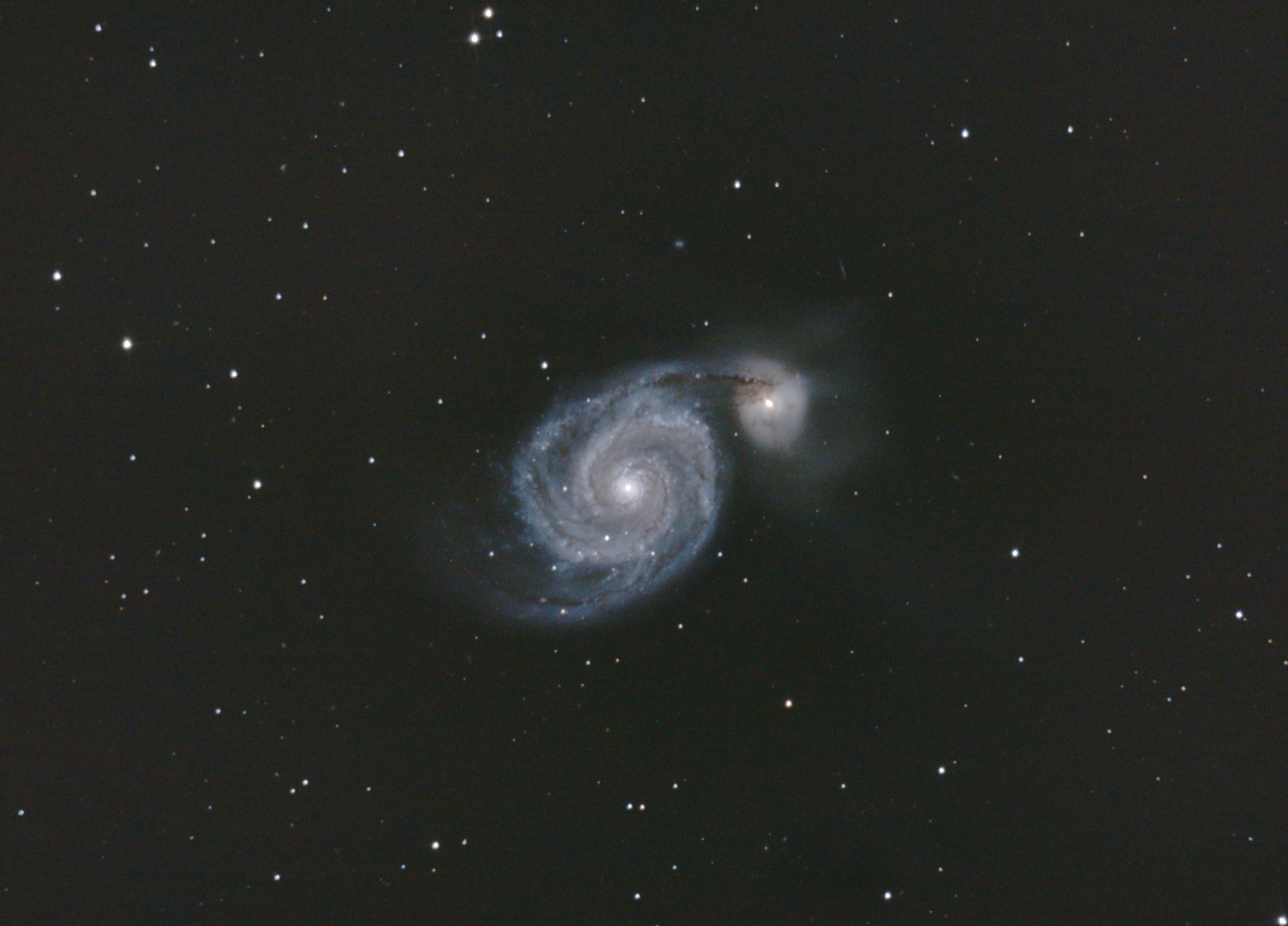 Interaction entre une galaxie spirale et une petite galaxie satellite, dans la constellation des Chiens de Chasse.